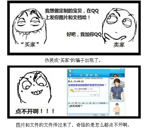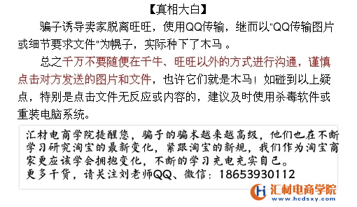 大家好,在淘宝店铺的运营过程中,各类骗术始终是我们作为卖家比较头疼的事情,汇材电商学院在临沂淘宝培训课程过程中,也遇到了各种不同类型的骗术,使得小伙伴们上当受骗,在此,给大家揭露一个发送文件给卖家,接收后在卖家电商中植入木马,从而盗取淘宝卖家的订单信息,对买家实施诈骗的一种骗术。请小伙伴们在日后的淘宝运营推广过程中一定要防止上当受骗。
